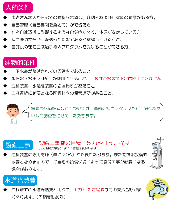 必要な条件と費用 矢吹病院≫在宅血液透析≫必要な条件と費用 在宅血液透析の特徴 導入までの流れ 診察時間(土日は休診) 時間帯 月 火 水 木 金 一般外来 午前 ◎ ◎ ◎ ◎ ◎ 午後 ー ー ー ー ー 詳しい診察情報はこちら 透析 月 火 水 木 金 土 午前 ◎ ◎ ◎ ◎ ◎ ◎ 午後 × ◎ × ◎ × ◎ 夜間 ◎ ◎ ◎ ◎ ◎ ◎ 詳しい透析情報はこちら 在宅血液透析 CAPD教育研修 CT検査のお申込み 血液透析 愛Pod計画 アクセスセンター 腎不全の治療選択 医療福祉相談 清永会の広報誌 キッド&レン NCD事業参加 カフェ・マルマーレ マルマーレ・レシピ集 ページトップへ